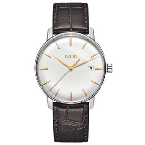 The Rado Coupole L Silver Dial Brown Leather Strap Quartz Mens Watch Model# R22864035 is a simple yet elegant and luxurious watch featuring a stainless steel case. The silver tone dial on the watch runs on Quartz movement and features gold-tone hour markers and hands. To protect the internal mechanism from outside harsh elements, the watch has a scratch-resistant crystal installed on it. The 3 o’clock position on the dial has a date display window. For an adjustable and secure fitting, the brown handcrafted leather strap on the watch has a push button release deployment clasp. It offers a submergence capacity of up to 50 meters/165 feet. Like all of our watches, this Rado Coupole L Silver Dial Brown Leather Strap Quartz Mens Watch is Brand New and comes in its original packaging!A globally recognized brand, Rado has been famous for its innovative design and the use of revolutionary materials to create some of the most mesmerizing, awe-inspiring and durable watches in the world. With beginnings in Lengnau in Switzerland, Rado has managed to be consistent at being a pioneer. Their brand philosophy “If we can imagine it, we can make it”, has gotten them to the point where many other brands are inspired by their class and pursuit of perfection and innovation. By launching their latest ultra-slim ceramic masterpiece True Thinline and the sporty-chic Rado HyperChrome built on the True Thinline’s case technology, Rado has yet again broken new grounds, keeping the generations old legacy up and living.
