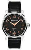 This elegant and unique Montblanc Timewalker Black Dial Black Leather Strap Automatic Mens Watch Model# 9674 features a polished stainless steel case and a bezel. The analog round black dial on the watch runs on a Swiss Automatic movement. The watch has silver tone and luminous hands and Arabic numeral hour markings and indices. There is a date display window at 6 o’clock position. Enhancing the overall look of the automatic watch is the durable black genuine leather strap with an alligator texture. This watch has submergence capacity of up to 30 meters/100 feet. Like all of our watches, this Montblanc Timewalker Automatic Mens Watch is brand new and comes in its original packaging!