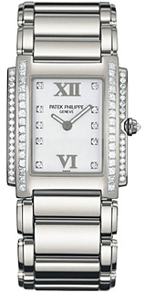 Patek Philippe Twenty-4 18k Solid White Gold Womens Watch Model# 4910-20g / 4910.20g. This watch features an 18k Solid White Gold Case and Bracelet, Beautiful White Dial with 10 Diamonds and Roman Numeral markers, Luminous Hand indicators, Dazzling Diamonds on case & on bezel (totalling approx. 1.10 carat), Scratch Resistant sapphire crystal, Double locking Deployment clasp for your convenience, Precise Swiss Quartz Movement, Ultra Thin Movement, Water resistant to 25 meters/80 feet. As all of our other watches, this watch is brand new and comes with its original box, warranty card and papers.