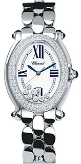 Chopard Happy Sport Oval 18k Solid Gold & Diamond Womens-Medium Watch Model# 27/8419-23 / 27-8419-23. This watch features a Stainless Steel case and bracelet, 18k Solid White Gold Bezel set with 110 diamonds (totalling 1.43 carat), beautiful White dial set with Roman Numeral markers, 7 floating diamonds (totalling 0.39 carat), 5 Sapphire Cabachons, Date Display at the 6 o'clock position, Second Hand, Scratch resistant sapphire crystal, Swiss Quartz Movement for unsurpassed precision, Water Resistant to 30 meters/100 feet and a Two Year Limited Warranty. As all of our other watches, this watch comes with the original box, warranty card and papers!